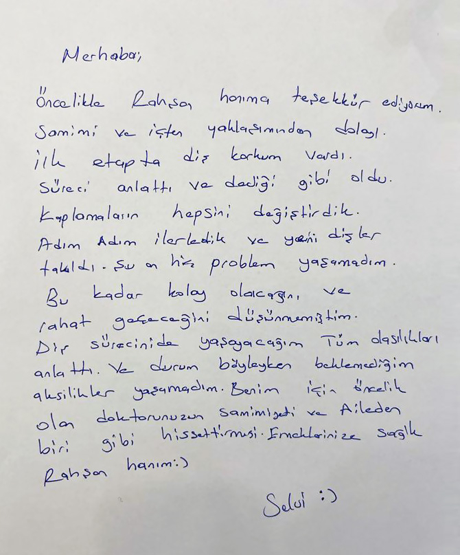 Öncelikle Rahşan hanıma teşekkür ediyorum. Samimi ve içten yaklaşımından dolayı ilk etapta diş korkum vardı. Süreci anlattı ve dediği gibi oldu. Diş kaplamaların hepsini değiştirdik. Adım adım ilerledik ve yeni dişler takıldı. Şuan hiç problem yaşamadım. Bu kadar kolay olacağını ve rahat geçeceğini düşünmemiştim. Diş sürecinde yaşacağım tüm olasıklıkları anlattı ve durum böyleyken beklemediğim aksilikler yaşamadım. Benim için öncelik olan doktorunuzun samimiyeti ve aileden biri gibi hissettirmesi. Emeğinize sağlık Rahşan hanım.